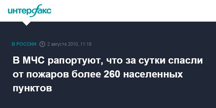 Москва. 2 августа. INTERFAX.RU - За истекшие сутки спасено от пожаров 265 населенных пунктов, заявляет начальник Национального центра управления в кризисных ситуациях (НЦУКС) МЧС России Владимир Степанов. "За истекшие сутки пожарными и спасателями МЧС России от природных и торфяных пожаров было спасено 265 населенных пунктов. За истекшие три дня не допущено возгорания ни одного дома", - сказал он, докладывая оперативную ситуацию заместителю председателя правительства Виктору Зубкову и главе МЧС России Сергею Шойгу.