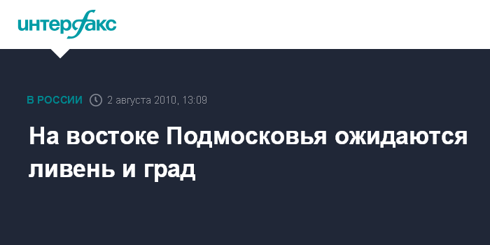 "2 августа, с 13 часов до 15 часов в восточной половине Московской области ожидаются ливень, местами гроза и местами град", - говорится в сообщении пресс-службы ведомства, поступившем в "Интерфакс".