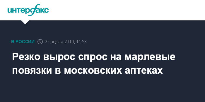 Москва. 2 августа. INTERFAX.RU - Москвичи раскупают марлевые повязки из-за дыма и гари, окутавших столицу, вследствие пожаров в Московской области. По сообщению корреспондента "Интерфакса" во многих аптеках столицы значительно увеличился спрос на ватно-марлевые повязки.