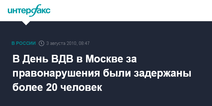 Москва. 3 августа. INTERFAX.RU - Во время празднования 80-летия Воздушно-десантных войск России за различные правонарушения в Москве были задержаны 24 человека, сообщил во вторник "Интерфаксу" источник в правоохранительных органах.