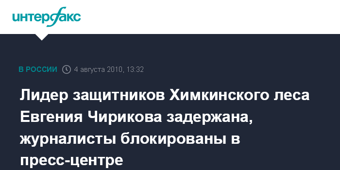 Москва. 4 августа. INTERFAX.RU - Задержана лидер движения в защиту Химкинского леса Евгения Чирикова.