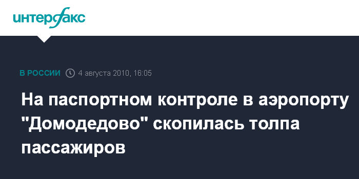 Москва. 4 августа. INTERFAX.RU - Сотни пассажиров в среду не могут пройти паспортный контроль в аэропорту "Домодедово", сообщил "Интерфаксу" один из очевидцев. "Работают всего несколько окон, никто не объясняет причин, ходят слухи о каких-то сбоях в компьютерной системе. Транзитные пассажиры опаздывают на свои рейсы", - сказал собеседник агентства. Некоторые пассажиры, по их словам, провели в очереди уже около трех часов. Пожилые люди жалуются на духоту, которая усиливается из-за запаха гари.
