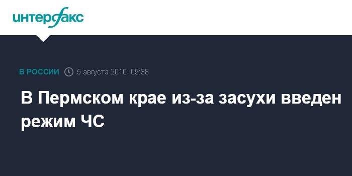 Москва. 5 августа. INTERFAX.RU - Правительство Пермского края ввело на территории региона режим чрезвычайной ситуации в связи гибелью посевов сельскохозяйственных культур от засухи.