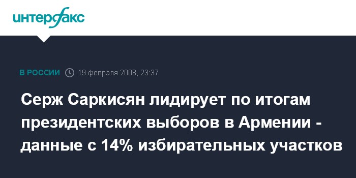 Ереван. 19 февраля. INTERFAX.RU -По результатам обработки данных со 111 избирательных участков в Армении, на выборах президента страны лидирует нынешний премьер-министр Серж Саркисян, сообщил глава ЦИК Армении Гарегин Азарян.