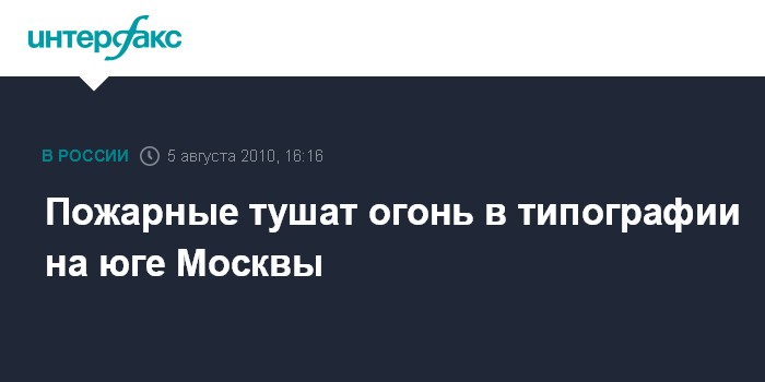 Москва. 5 августа. INTERFAX.RU - В тушении горящего здания типографии на юге Москвы участвуют десять пожарных расчетов, сообщили "Интерфаксу" в пресс-службе ГУ МЧС по Москве. "В настоящее время на место происшествия прибыло 10 пожарных расчетов, которые приступили к тушению здания типографии", - сказали в пресс-службе. Там отметили, что пожару не присваивался повышенный номер сложности.