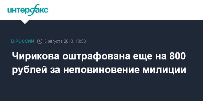 "Чирикова была признана виновной по статье 20.2 КОАП РФ (организация незаконного митинга) и оштрафована на сумму 1500 рублей, а также признана виновной по ст. 19.3 (неповиновение сотрудникам милиции) КОАП РФ и оштрафована на 800 рублей", - сообщили "Интерфаксу" в пресс-службе Мособлсуда.
