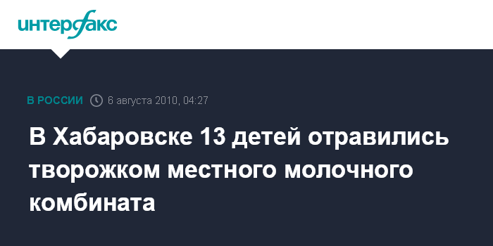 Хабаровск. 6 августа. ИНТЕРФАКС-ДАЛЬНИЙ ВОСТОК - Хабаровский комбинат детского питания "Молочный край" приостановил производство, как минимум, на пять дней из-за выявленных случаев отравления детей продукцией предприятия.