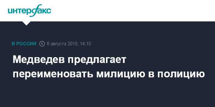 Горки. 6 августа. INTERFAX.RU - Президент России Дмитрий Медведев предложил переименовать милицию и вернуться к дореволюционному названию - "полиция".