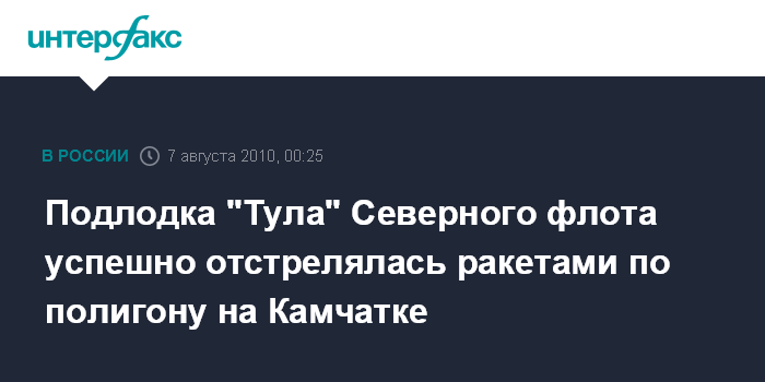 Москва. 7 августа. INTERFAX.RU - Атомная подводная лодка Северного флота "Тула" в пятницу произвела залповую стрельбу двумя межконтинентальными баллистическими ракетами из акватории Баренцева моря по полигону Кура на Камчатке.