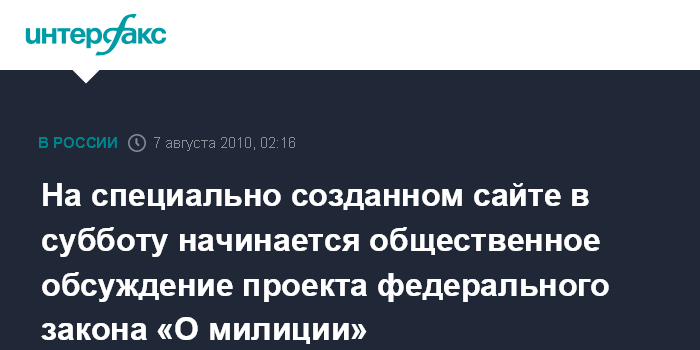 Москва. 7 августа. ИНТЕРФАКС - Публичное обсуждение нового законопроекта - "О милиции" - начинается в субботу в Интернете. Проект федерального закона впервые выносится на суд общественности таким образом.