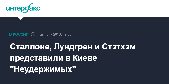 Киев. 7 августа. ИНТЕРФАКС-УКРАИНА - Голливудские актеры Сильвестр Сталлоне, Дольф Лундгрен, Джейсон Стэтхэм презентовали в субботу в Киеве приключенческий боевик "Неудержимые" в рамках мирового промо-тура.
