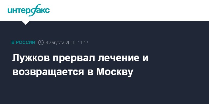 Москва. 8 августа. INTERFAX.RU - Мэр Москвы Юрий Лужков прерывает свое лечение от спортивной травмы и в связи со складывающейся ситуацией в городе из-за природных пожаров в Подмосковье возвращается в столицу в воскресенье. Об этом "Интерфаксу" сообщил пресс-секретарь мэра Москвы Сергей Цой.