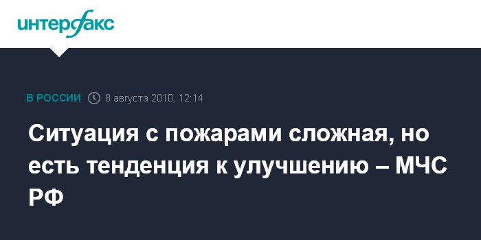 Москва. 8 августа. INTERFAX.RU - В МЧС России отмечают тенденцию к улучшению ситуации с природными пожарами. "Ситуация с природными пожарами на территории Российской Федерации остается сложной, но наметилась тенденция к улучшению обстановки", - сообщила в воскресенье журналистам начальник управления информации МЧС России Ирина Андрианова.
