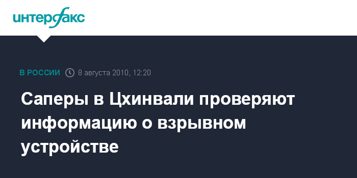 Цхинвали. 8 августа. INTERFAX.RU - На привокзальной площади Цхинвали, по предварительным данным, найдено взрывное устройство, сообщили "Интерфаксу" в дежурной части МВД Южной Осетии. В настоящее время на место обнаружения выехали саперы. Место оцеплено. Подробностей пока не сообщается.