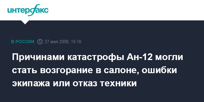 Москва. 27 мая. INTERFAX.RU - Следствие отрабатывает различные версии катастрофы самолета Ан-12 под Челябинском, среди которых - возгорание в салоне, ошибки экипажа или отказ техники.