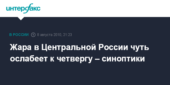 Москва. 8 августа. ИНТЕРФАКС - Некоторое снижение температуры в центральном регионе России можно ожидать только 12-13 августа прогнозирует служба Гидрометеорологии и мониторинга окружающей среды.