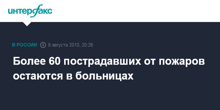 Москва. 9 августа. INTERFAX.RU - В больницах остаются 62 пострадавших в результате природных пожаров в российских регионах, всего за медпомощью за период чрезвычайной ситуации обратились 741 человек, сообщает Минздравсоцразвития РФ.