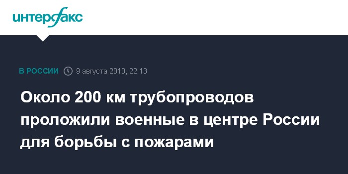 Москва. 9 августа. ИНТЕРФАКС - Два трубопроводных батальона тыла Вооруженных сил РФ с начала пожароопасного периода проложили на территории Московской, Нижегородской, Рязанской и Владимирской областей около 200 километров трубопроводов, сообщил в понедельник журналистам пресс-секретарь управления пресс-службы и информации Минобороны РФ по тылу капитан Владимир Дробышевский.