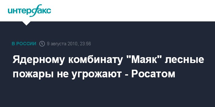 Москва. 9 августа. ИНТЕРФАКС - В госкорпорации "Росатом" заявляют об отсутствии угрозы ядерному комбинату "Маяк" (Озерск, Челябинская область) в связи с лесными пожарами.