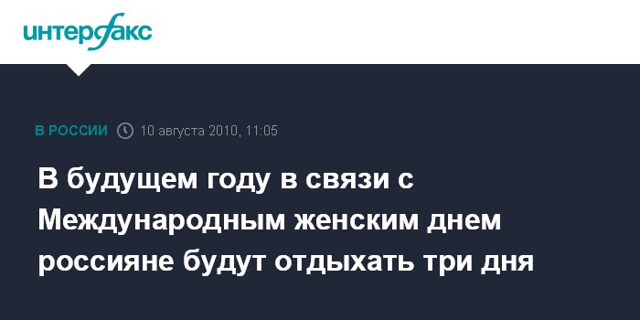 Москва. 10 августа. INTERFAX.RU - В следующем году в связи с Международным женским днем, отмечаемым 8 марта, россияне будут отдыхать три дня. В соответствии с постановлением правительства, в 2011 году выходной день с субботы 5 марта переносится на понедельник, 7 марта. Таким образом, нерабочими в стране будут 3 дня - 6, 7 и 8 марта.