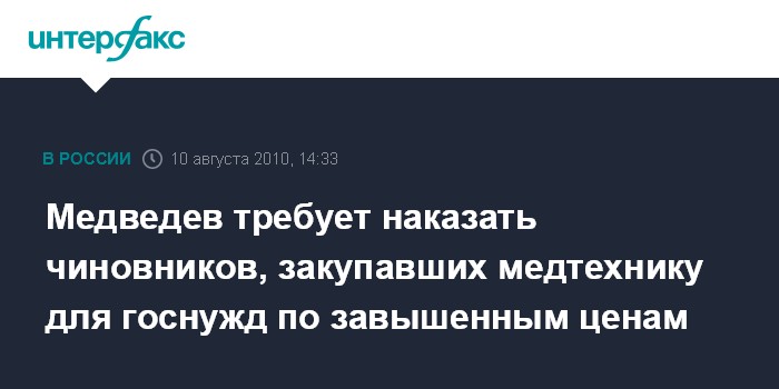 Сочи. 10 августа. INTERFAX.RU - Президент России Дмитрий Медведев заявил о необходимости сурового наказания для всех, кто причастен к закупке медтехники для государственных нужд по завышенным ценам.