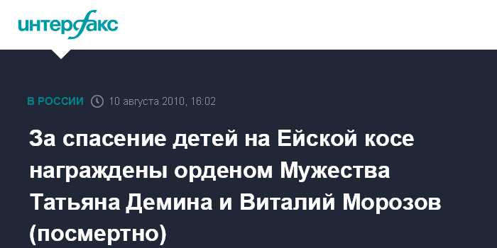 Сочи. 10 августа. INTERFAX.RU - Президент России Дмитрий Медведев наградил орденом Мужества за спасение детей на Ейской косе Татьяну Демину и посмертно Виталия Морозова, сообщила журналистам пресс-секретарь главы государства Наталья Тимакова.