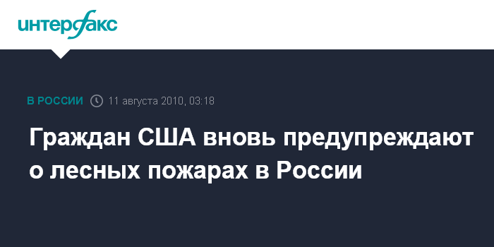 Вашингтон. 11 августа. ИНТЕРФАКС - Государственный департамент США предупреждает американских граждан о сохраняющемся риске поездок в Россию в связи с продолжающимися лесными пожарами.