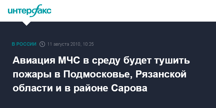 Москва. 11 августа. INTERFAX.RU - Авиация МЧС России в среду проведет активную операцию по тушению лесных пожаров в Московской и Рязанской областях, заявил журналистам начальник Национального центра управления в кризисных ситуациях (НЦУКС) МЧС России Владимир Степанов. "В среду авиация МЧС России проведет массированные удары по лесным пожарам на территории Московской и Рязанской областей, а также в районе города Саров Нижегородской области", - сказал он. По его словам, обстановка в районе города Снежинск Челябинской области "полностью стабилизирована и снята с контроля".