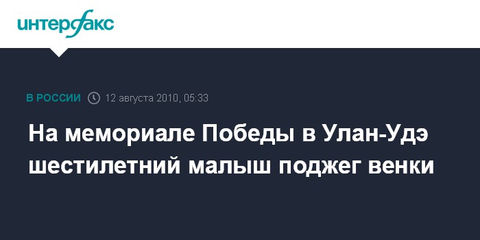 Чита. 12 августа. ИНТЕРФАКС-СИБИРЬ - МВД Бурятии намерено оштрафовать мать шестилетнего мальчика, который в среду вечером поджег венки у мемориала Победы в Улан-Удэ.