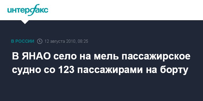 Салехард. 12 августа. INTERFAX.RU - Пассажирское судно "Метеор", на борту которого находилось 123 человека, в том числе дети, беременные и пожилые женщины, село на мель на реке Полуй в семи километрах от Салехарда в Ямало-Ненецком автономном округе, сообщает главное управление МСЧ РФ по ЯНАО. Авария произошла в среду в 14:25 мск.