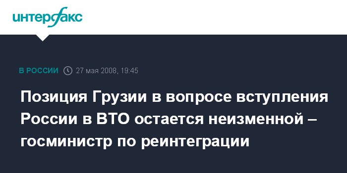 Тбилиси. 27 мая. ИНТЕРФАКС - Позиция Грузии по отношению ко вступлению Российской Федерации во Всемирную торговую организацию (ВТО) остается неизменной, заявил госминистр Грузии по реинтеграции Темур Якобашвили журналистам во вторник.