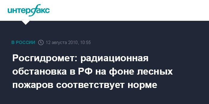 Москва. 12 августа. INTERFAX.RU - Руководство Федеральной службы по гидрометеорологии и мониторингу окружающей среды (Росгидромет) заявляет, что радиационная обстановка в России, в том числе в районах, пострадавших от Чернобыльской аварии, из-за лесных пожаров не ухудшилась. "У нас плотная сеть мониторинга, мы проводим учащенное наблюдение. Ухудшения радиационной обстановки и роста фонового загрязнения в результате переноса продуктов горения нигде в России не зафиксировано", - сказал "Интерфаксу" в четверг заместитель руководителя Росгидромета Валерий Дядюченко.