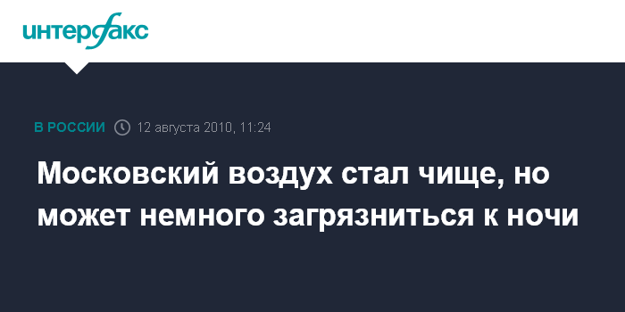 Москва. 13 августа. INTERFAX.RU - Московский воздух в четверг утром очистился от смога, однако ночью ожидается незначительный рост содержания в атмосфере загрязняющих веществ, сообщили "Интерфаксу" в "Мосэкомониторинге". "Среднесуточные концентрации снижаются, по веществам - "индикаторам горения" - нормативы не превышены: РМ10 - 0,5-0,9 ПДКсс, угарный газ - 0,1-0,4 ПДКсс. Во второй половине дня кардинальных изменений в обстановке не ожидается", - сообщил собеседник агентства.
