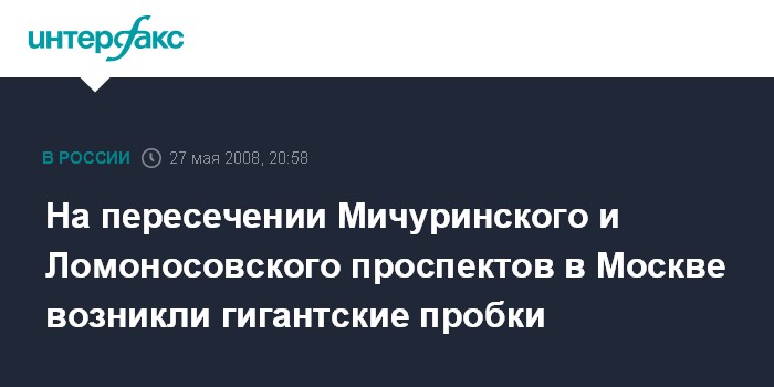 Москва. 27 мая. ИНТЕРФАКС - Из-за гигантских автомобильных пробок практически полностью парализовано движение на пересечении Мичуринского и Ломоносовского проспектов в Москве, передает корреспондент "Интерфакса".
