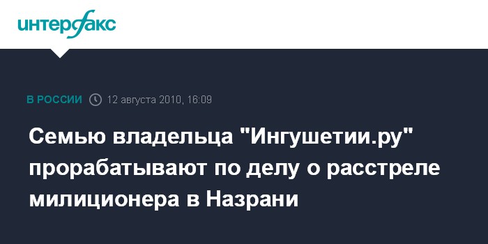 Москва. 12 августа. INTERFAX.RU - Родственников застреленного при доставке на допрос владельца сайта "Ингушетия.ру" Магомеда Евлоева проверяют на причастность к убийству в Назрани сотрудника МВД, осужденного по делу о гибели оппозиционера.