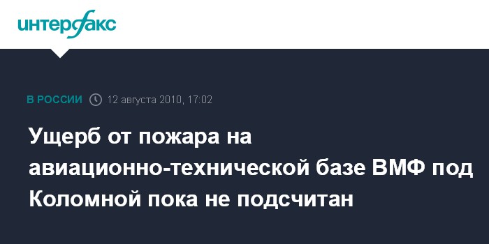 Москва. 12 августа. INTERFAX.RU - Сумма ущерба, которую пожар причинил 25-й Центральной авиационно-технической базе морской авиации ВМФ под Коломной, пока не определена, заявил бывший начальник базы подполковник Виктор Биронт.