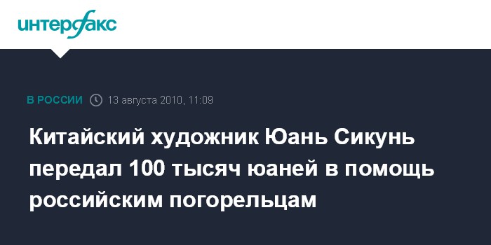 Москва. 13 августа. INTERFAX.RU - Китайский художник пожертвовал почти полмиллиона рублей в пользу пострадавших от лесных пожаров в РФ.