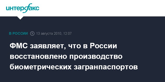 Москва. 13 августа. ИНТЕРФАКС - В Федеральной миграционной службе заявили, что на НИИ "Восход" удалось восстановить производство десятилетних биометрических загранпаспортов.
