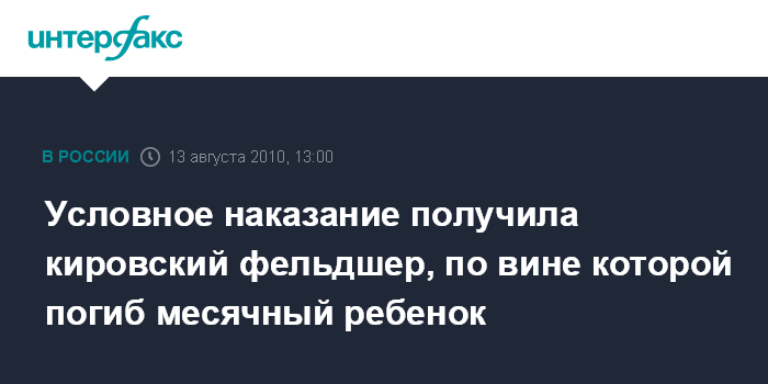 Москва. 13 августа. INTERFAX.RU - Суд в Кировской области признал виновной фельдшера Орловской центральной районной больницы Викторию Колбину, по вине которой скончался младенец.