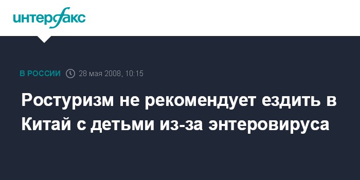 Москва. 27 мая. INTERFAX.RU - Федеральное агентство РФ по туризму (Ростуризм) просит граждан в течение нескольких месяцев воздержаться от поездок с малолетними детьми в Китай из-за вспышки энтеровирусной инфекции.
