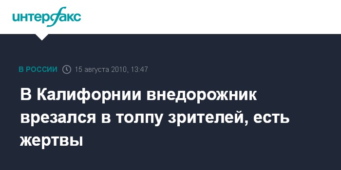 Лондон. 15 августа. INTERFAX.RU - В США на юге Калифорнии автомобиль врезался в толпу зрителей во время гонок внедорожников, в результате чего погибли по меньшей мере восемь и пострадали 12 человек.