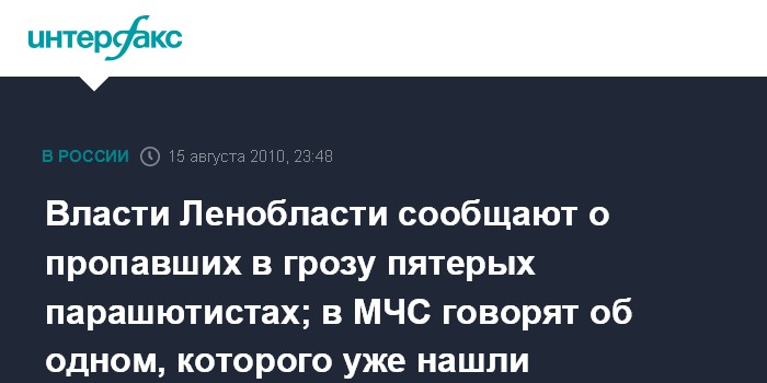 Между тем в Главном управлении МЧС по Ленинградской области "Интерфаксу" сообщили, что у спасателей была информация только об одном пропавшем в грозу парашютисте.