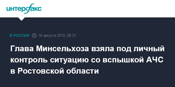 Москва. 16 августа. INTERFAX.RU - Министр сельского хозяйства РФ Елена Скрынник дала указания руководителям Россельхознадзора и департамента животноводства и ветеринарии выехать в Ростовскую область на крупный свинокомплекс, где был выявлен очаг африканской чумы свиней (АЧС), сообщил в субботу "Интерфаксу" официальный представитель Минсельхоза РФ Олег Аксенов.