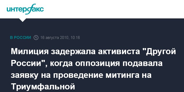 Москва. 16 августа. INTERFAX.RU - Одного из актикивтов опозиции задержали при подаче заявки в мэрию Москвы для согласования с властями митинга в защиту свободы собраний 31 августа на Триумфальной площади.