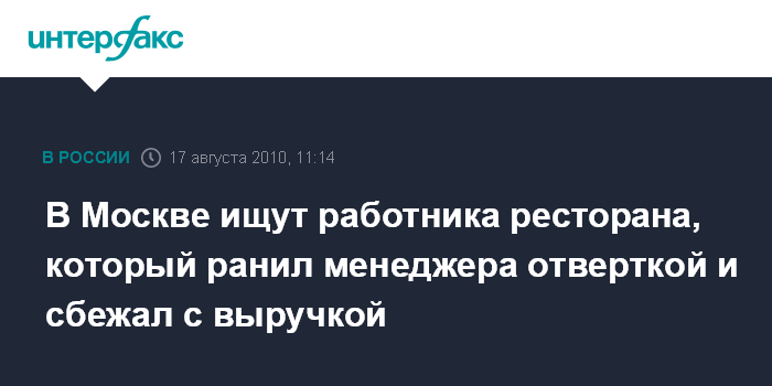 Милиционеры, прибыв на место происшествия, установили, что рабочий ресторана причинил несколько ранений менеджеру, после чего забрал 190 тыс. руб. и скрылся, сообщил источник.