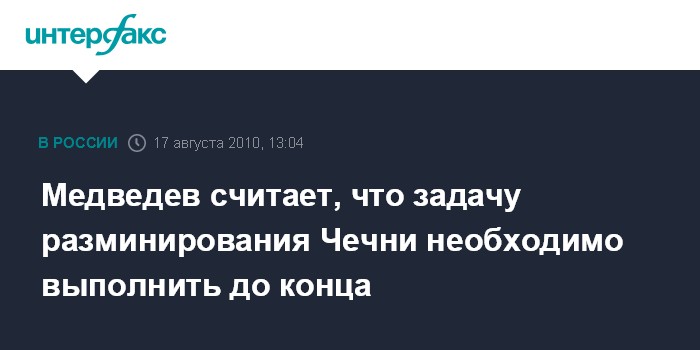 Москва. 17 августа. INTERFAX.RU - Президент РФ Дмитрий Медведев сообщил, что поручит Минобороны и МЧС довести до конца процесс разминирования в Чечне.