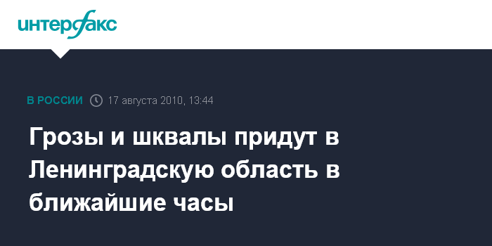 Санкт-Петербург. 17 августа. INTERFAX.RU - В Ленинградской области в ближайшие 1-3 часа пройдут грозы со шквалистым ветромдо 17-22 м/с, сообщает пресс-служба регионального МЧС.