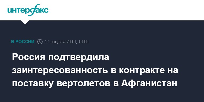 Со своей стороны, информированные источники в Москве заявили "Интерфаксу", что для получения контракта на поставку вертолетов в Афганистан российской стороне, возможно, придется вступить в конкурентную борьбу с рядом стран НАТО, также заинтересованных в получении этого контракта. Кроме того, по словам источников, "потребуется решить целый ряд проблем с финансированием таких поставок".