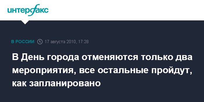 Москва. 17 августа. INTERFAX.RU - Информация о полной отмене праздничных мероприятий в Москве в День города в 2010 году, распространенная некоторыми СМИ, не соответствует действительности, заявил "Интерфаксу" источник в столичной мэрии.