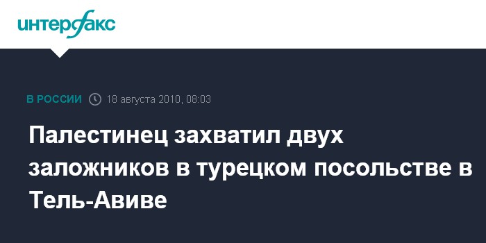 Иерусалим. 17 августа. INTERFAX.RU - Палестинец удерживает двух заложников в одном из офисов в здании посольства Турции в Тель-Авиве, сообщает во вторник веб-сайт израильской газеты Haaretz.